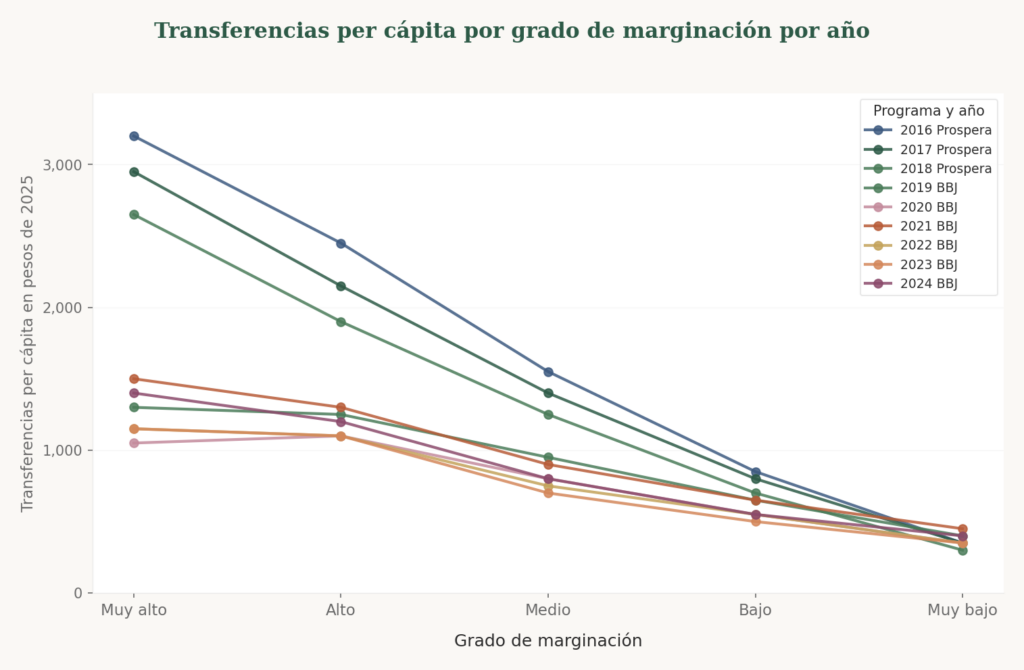 En concreto, las transferencias per cápita a los hogares en los municipios más marginadas fueron significativamente más bajas bajo el nuevo programa de BBJ que con Prospera. Mientras que el programa Prospera mostraba un alto grado de progresividad en las transferencias per cápita donde los hogares en municipios más pobres eran quienes más recursos recibían, esta progresividad se perdió en gran medida con el nuevo programa.